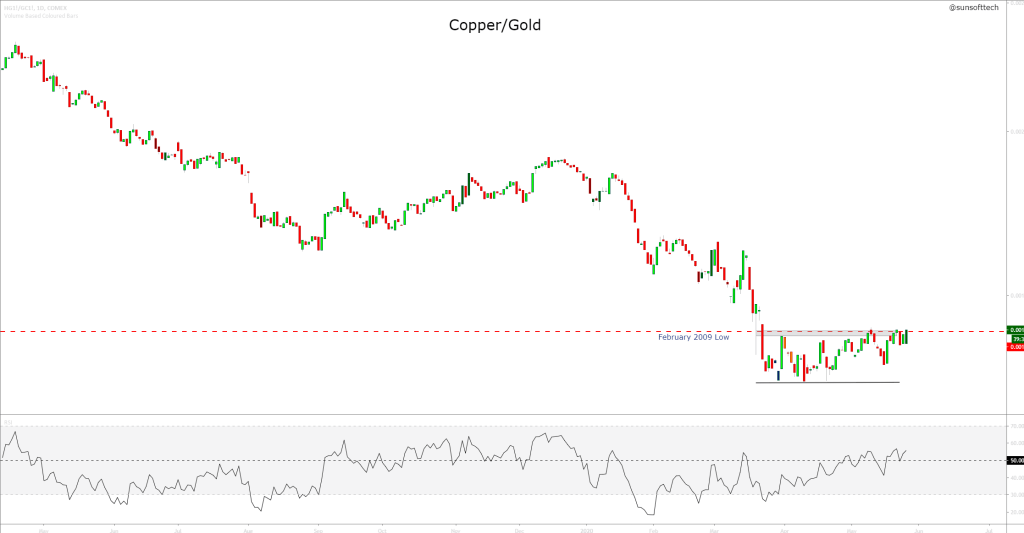 The Copper to Gold ratio is an indicator of global economic growth and risk appetite. Rising ratio is indicative of increasing preference for risk. This ratio formed a base below February 1999 lows and closed above the resistance on daily chart today. Confirmation of breakout is required on weekly close basis.