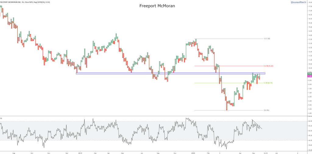 FCX has given a return of 44.91% since April 1, 2020. The break above resistance of 9.50 supported by momentum indicates further upside.