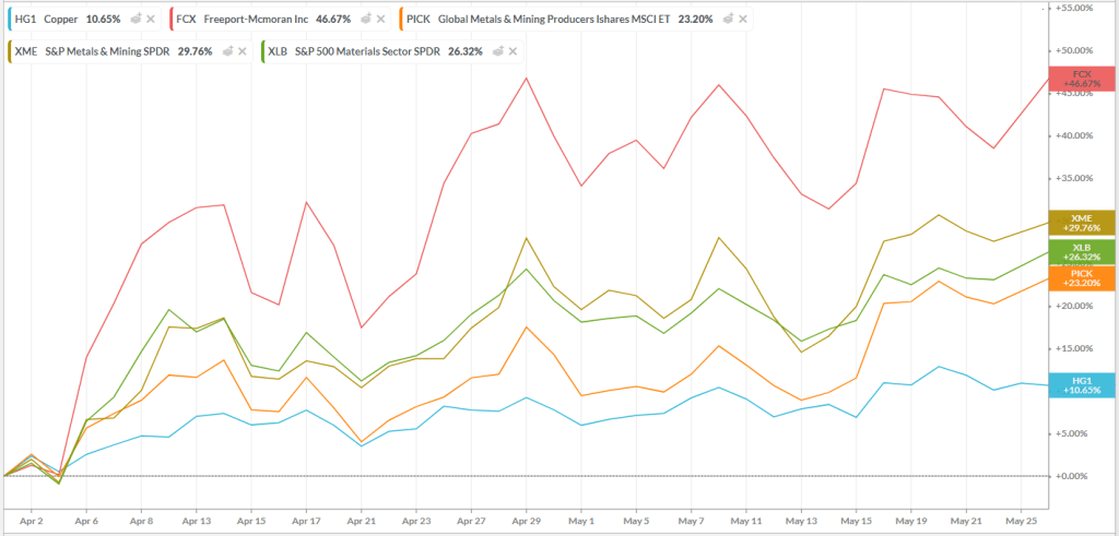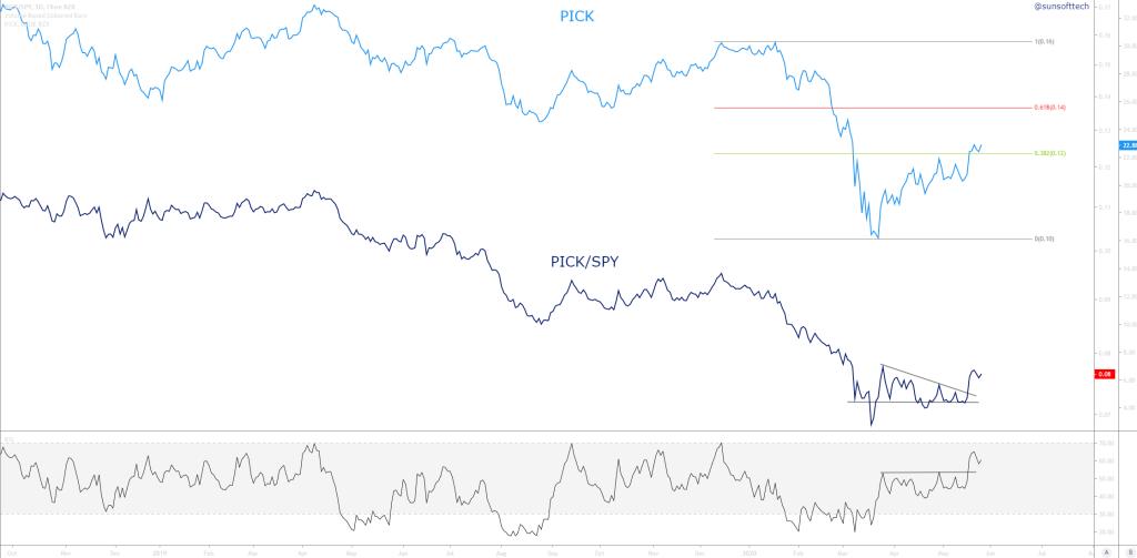 Base Material ETFs XLB, XLI and PICK are highly correlated to FCX. All are showing upside momentum on absolute basis and relative to SPY.