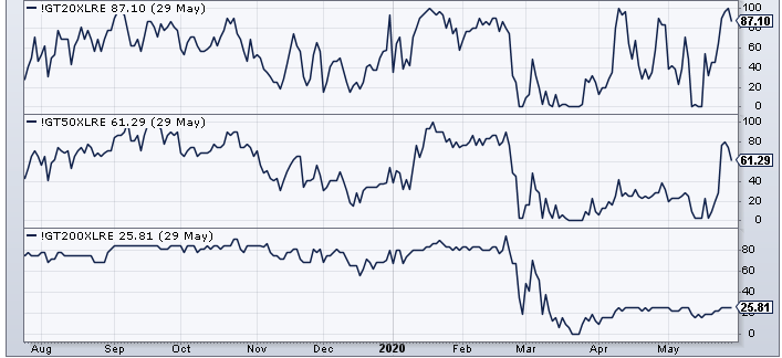 Short Term (% stocks >20 MA), Medium Term (% stocks >50 MA) is bullish for all three sectors. XLU and XLP have good Long Term breadth (% stocks >200 MA). XLRE is at 26%.