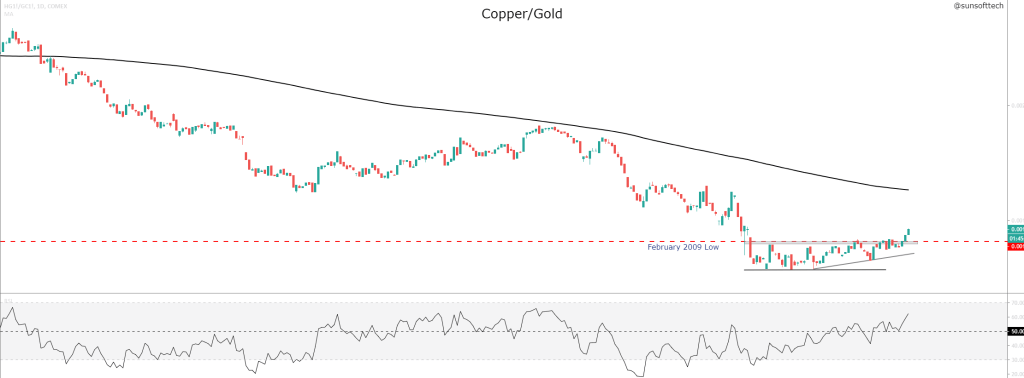 Copper/Gold Ratio has been forming a base below February 1999 lows. After two failed attempts, it has finally managed to break and remain above this level for the past 3 days, supported by momentum.