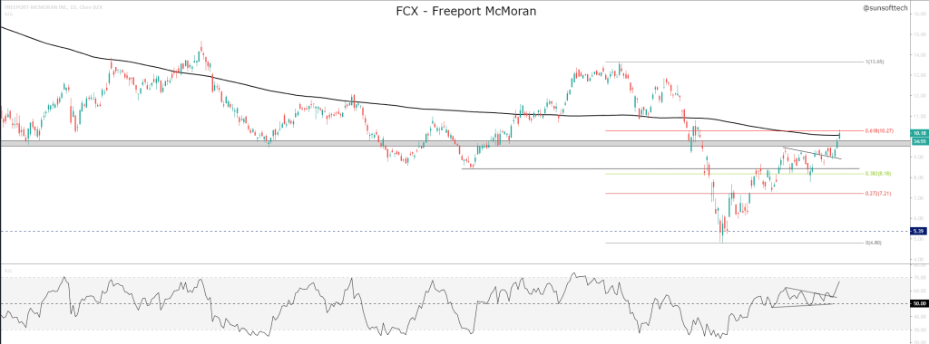 Weak US Dollar strengthens copper which is priced in US dollar. Largest Copper Miner Freeport McMoran (FCX) which is a proxy for copper is in a 9.50 – 10.30 resistance zone. This is a confluence of resistance from 2018 lows, 200 day Moving Average and 61.8% retracement of the last major swing. Momentum has broken from a coil and supporting the move upwards.