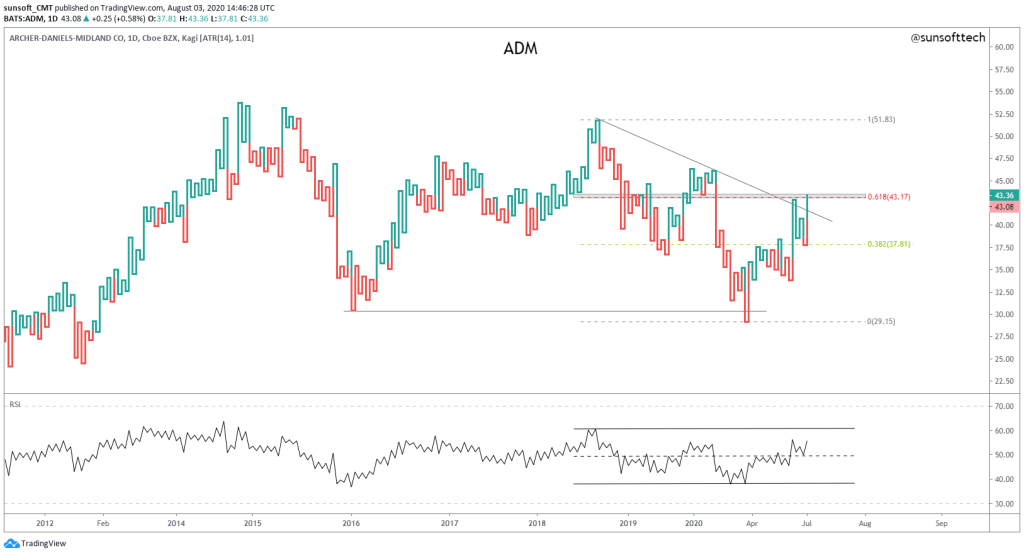 $ADM: Archer-Daniels-Midland Company is in the business of procurement, transport and processing of agricommodities, feed product import, export, and distribution; and structured trade finance activities. It has broken out from its downtrend line since its October 2018 high and is currently at the resistance of 61.8% retracement. A break above 43.50 may lead the price to a target of 52.