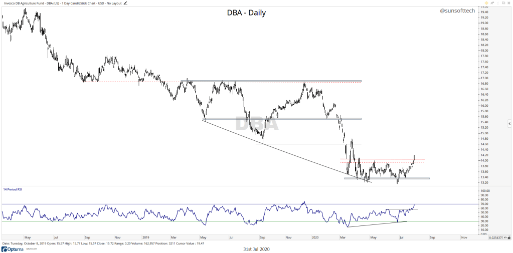Agricommodities are the raw materials for Processed Food and Beverage industry and Feed for Livestock. The Agricommodities ETF ($DBA) has broken out from a base on both price and momentum. Most of its constituents have been rising steadily for a month.
