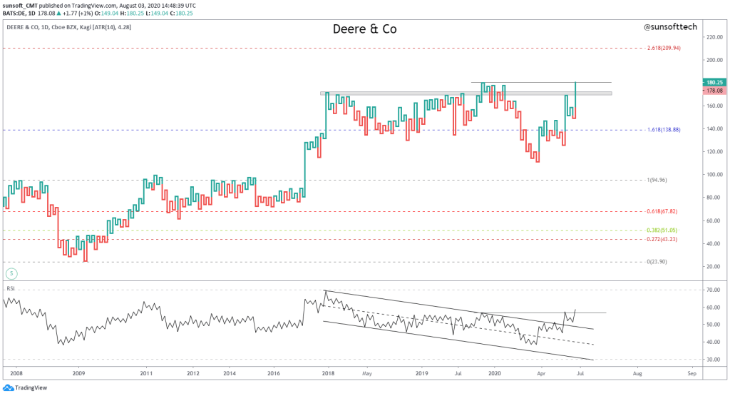 $DE: Deere & Company is one of the largest manufacturers of agricultural and farm equipment. It is trading near its 52 week high (181.99). I will be watching for price to consolidate and break above this level with a probable target 210.