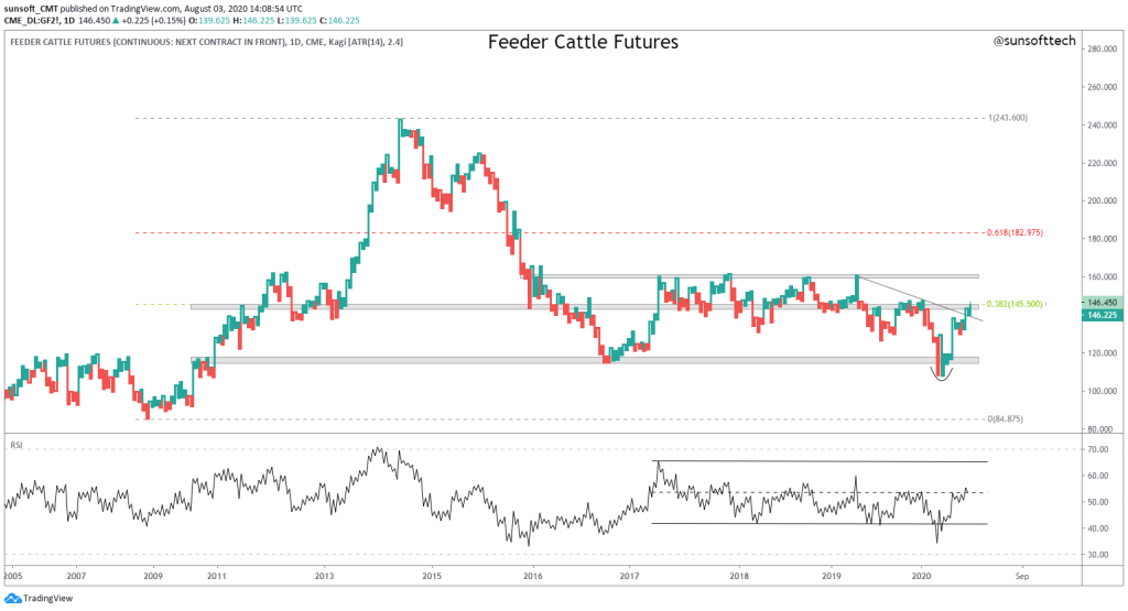 Feeder Cattle Futures: Soybean, Wheat and Corn, along with cotton seed are used in feed for livestock. Increase in their prices also increases the cost of feed which forms a major chunk of livestock production costs. Feeder Cattle Futures have been range bound since 2016. After a failed break down from this range support, the price has broken above the downtrend line from April 2019 high and 38.2% retracement of October 2014 high, supported by momentum.