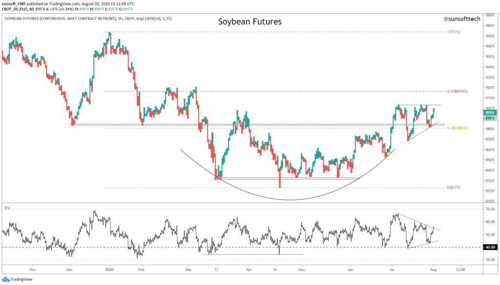 Soybean Futures have formed a base since their March lows and a pullback to overhead resistance. A break from the ascending triangle forming around 38.2% retracement from December 2019 high may be bullish.